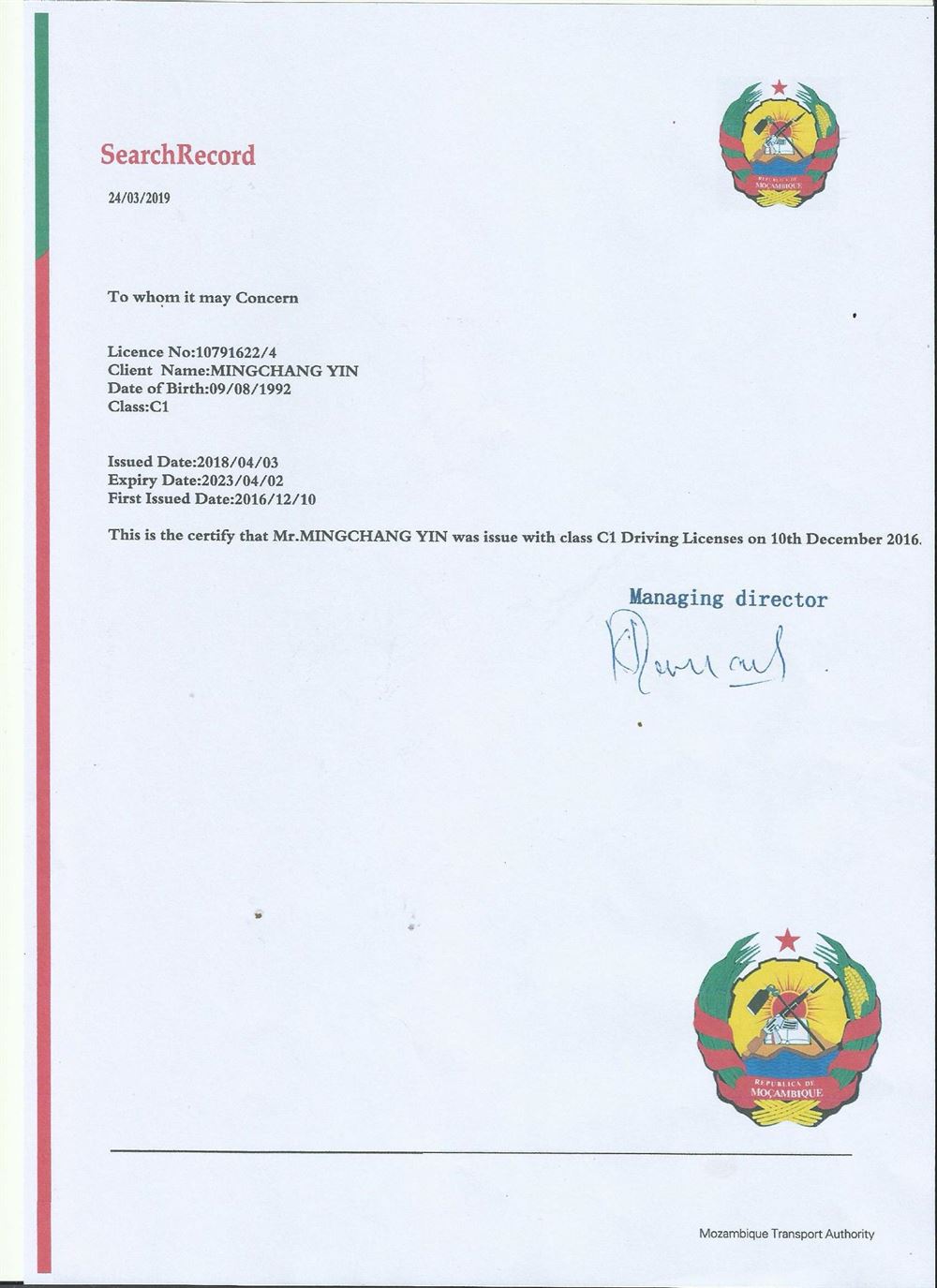 咸陽阿博爾翻譯公司 您身邊的翻譯 咸陽市區(qū)隨到隨譯 咸陽車管所認(rèn)可 莫桑比克駕照證明翻譯模版